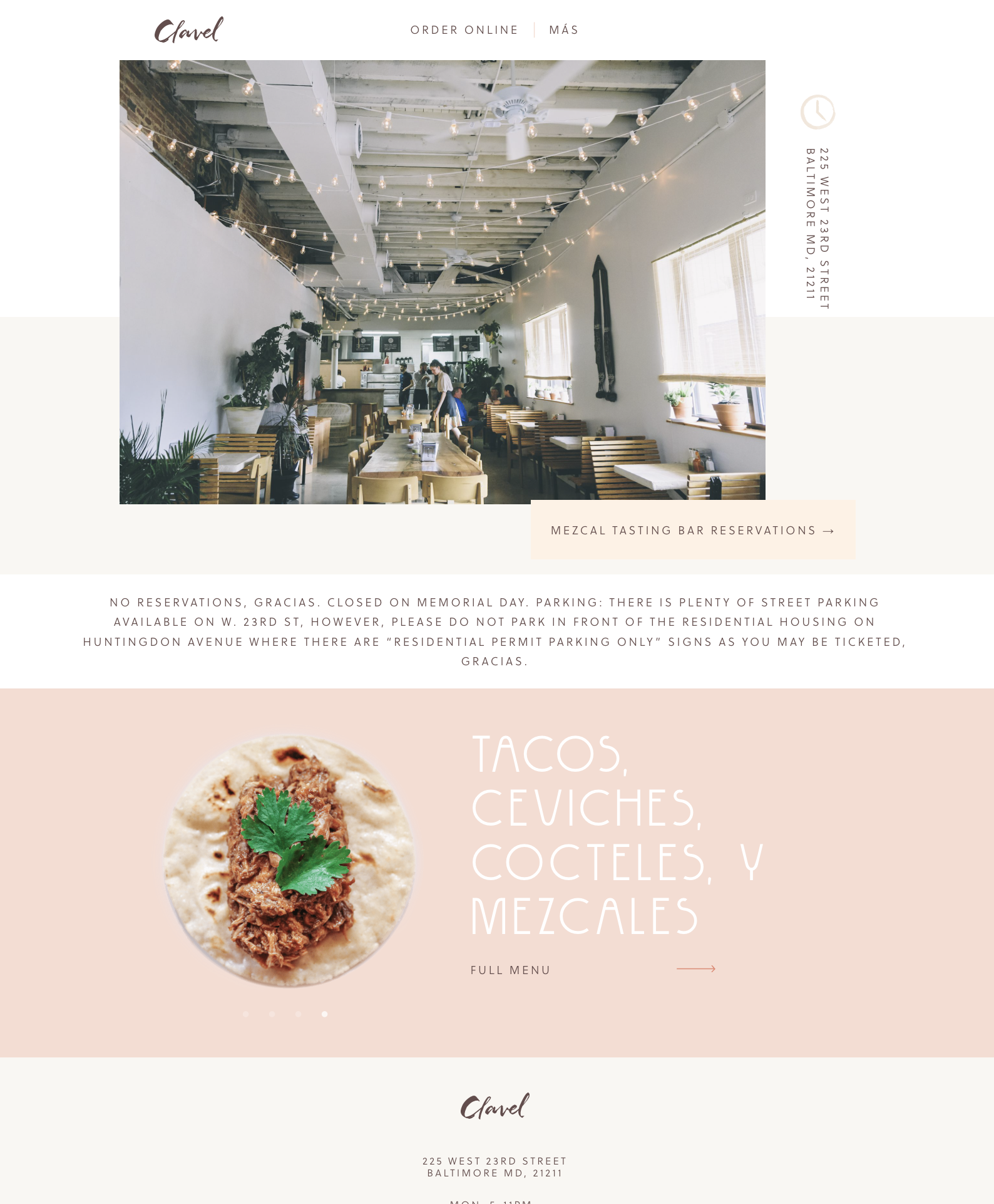 Clavel and WC Harlen have always been two of our favorite establishments and Lane has been a good friend of ours for years so when she reached out to us about redesigning her website it is safe to say we were excited to work with her on it. Lane is one of Baltimore’s best tastemakers. Nobody in this city asked for a Mezcaleria, but they’re sure glad she brought one to Baltimore now. Her vision, and execution of that vision, has always been spot on. Her design preferences aligned well with our own which made this redesign a piece of tres leches. See for yourself.